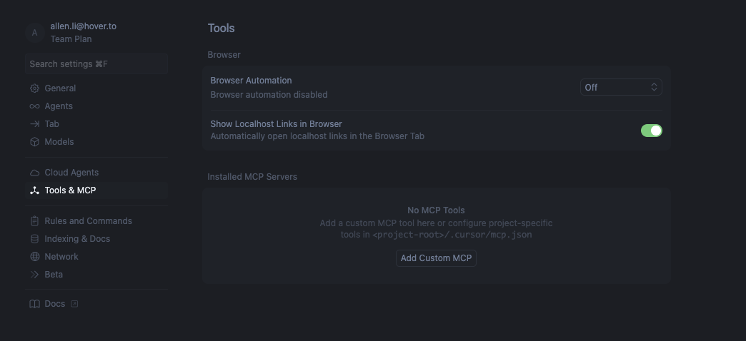 Navigate to the Cursor settings page and click on the "Tools & MCP" Tab. It should look something like this:
