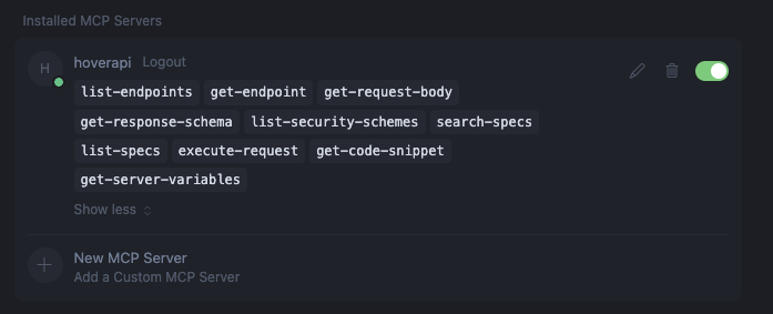 After a successful connection you'll see the following in your Installed MCP Servers section of Cursor settings. Now your built-in chat bot will be able to access the Hover MCP. Happy developing!