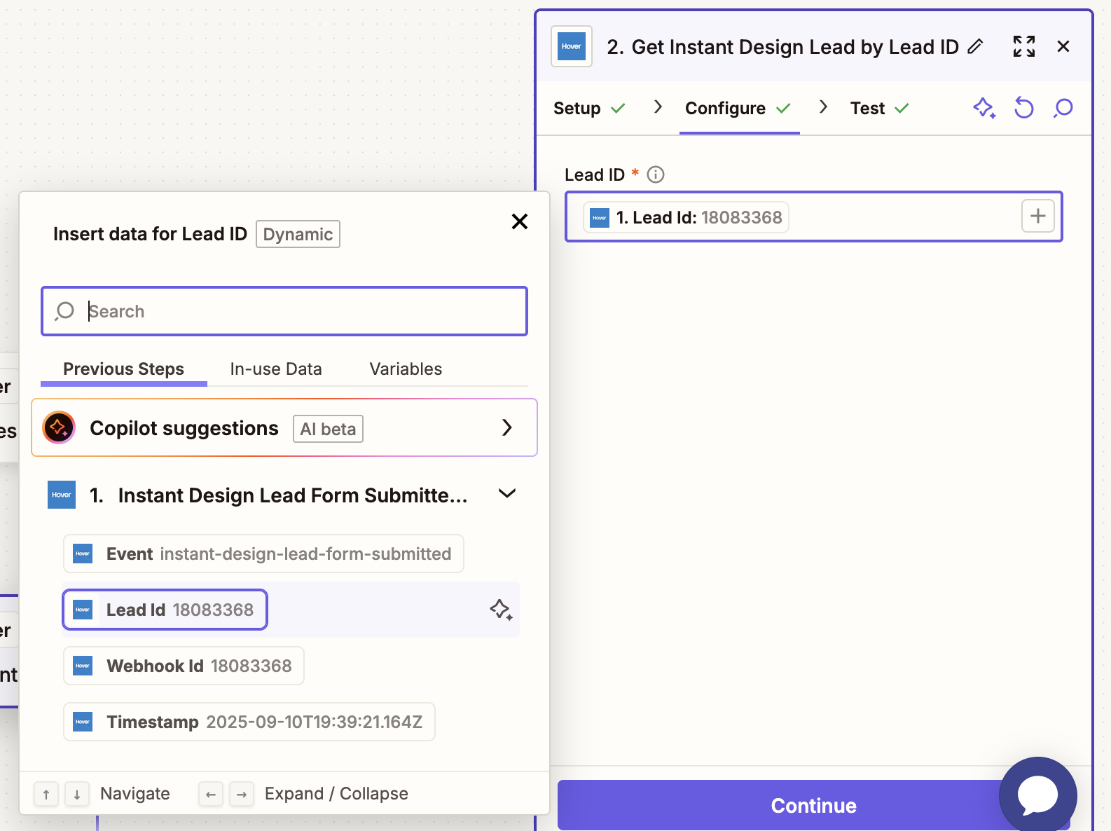 - In these actions, insert the data pills from the Get Instant Design Lead by Lead ID step.