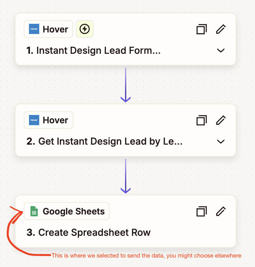 If you use the Hover Lead Convert feature, Hover allows you to access your leads via Zapier. We make the data available so you can send it to other tools you use that have a Zapier presence. An example of this would be getting the Hover Lead data and piping it into a Google sheet, your CRM, or another tool.